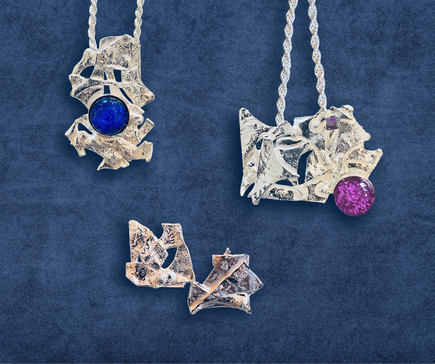 To create our abstract collection, pieces of sterling silver are heated and sculpted into architectural forms by artist Sandra Fowler. Fused glass is added for more bold, daring statement pieces.